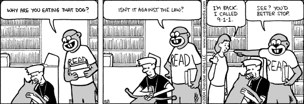 Today I drew the last strip for Volume 2, and as of right now I've fixed all known "bugs." I'm not sure what the correct publishing term is - they aren't typos. We had to rescan and re-post-produce several months' worth of strips from the notorious hard drive crash of '03. This often means comparing the strip-as-drawn to the version on the website to see what changed. I often change bits of dialog or subtle parts of drawings, so it's a real challenge. I'll shortly begin printing out the first draft of the inside which I'll pass on to my friend Rob for proofing. Tomorrow is Cover Day. I have a draft cover which I'm very fond of, my challenge now is to draw it without making it worse.