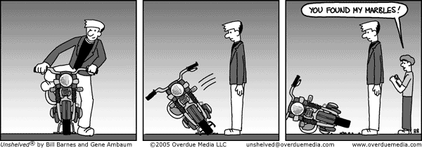 I think I'm finally figuring out how to draw Dewey's motorcycle. Which is good, because now his Grandma has a scooter and I'll be damned if I can draw it right. Some folks were worried that Dewey isn't wearing a helmet. He does use one - he had already taken it off and put it on the side of his bike. You can see it supporting the bike on the ground. It took some damage, a point we will mention.
