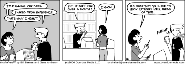 We got a piece of mail this weekend from our reader complaining about the last week's grocery sequence saying, in effect, "go back to the library." She listed some of the strips she liked best, and they were all firmly about the library. Our answer closely follows the answer we've given a lot recently - our strip is about the characters. Sometimes the library is in the foreground, sometimes in the background, and once in a rare while (and it really will be rare) it's off panel entirely. But just like real life, everyone goes back to the library.