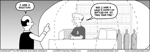 I had been getting a little concerned that our email list numbers have been levelling off. Then I looked at our RSS feed numbers, which have been taking off. If you add the two together you see a firm upwards trend. This corroborates the comments from people who unsubscribe - many of them say they're switching over to RSS. One day I may replace that number at the top left of our home page with a new number. Or I may just say something like "Over 15,000 people read Unshelved every day" which will help me not obsess over said number.