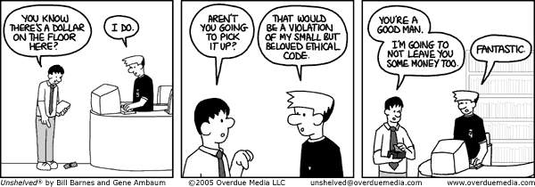 In June we published our twelve hundredth Unshelved strip. That's about eleven hundred and ninety more of anything than we've ever made before. People ask us where we get our ideas. The answer, of course, is you. Please send us your true-life tales from the library (or anywhere else). They don't have to be ha-ha funny. In fact, the weirder, the more random, the more disturbing the story, the more fertile the cartooning ground. Just ask the folks who sent us Bacon As Bookmark, Psychic, and Reanimator. All true.
