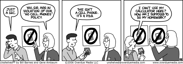 ... didn't we just do a "no cell phones" sequence? Yes. But we discovered that we had a little more to say about it, so here are a few bonus strips on the topic. Meanwhile my friend Dave over at Sheldon has been doing a hysterical sequence on those Bluetooth headsets that make everyone look like they're the Borg. Not to be missed.