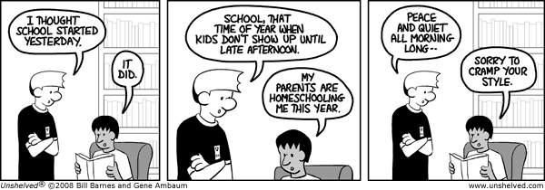In today's strip we reveal that Sanjay, Merv's friend (and The Shusher's sidekick Whisper), is to be homeschooled. I've been meaning to write this sequence forever, and finally got around to it. It seems very appropos, since it feels like we, as a homeschooling family, use libraries to an absurd degree.