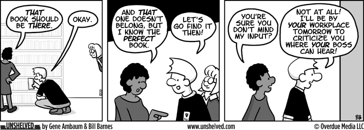 The problem? We’ve spoken at so many events that we are literally running out of new places to go. But that’s cool, because we now have more than one talk. Last year we made return engagements at the New York and California Library Associations, performing our new talk “Surviving The Public: the Unshelved approach to customer service”, and this February we’ll be doing it again at the Alaska Library Association. So if you’ve hired us before, you can do it all over again!