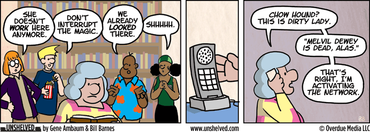 In case you missed last week’s announcement, a reminder that we are in the midst of an Epic Crossover between Unshelved and my other comic strip Not Invented Here. This storyline began in NIH here, continued for two weeks through here, then switched over to Unshelved last week starting here and will run through Thursday, switching back to NIH for the conclusion.