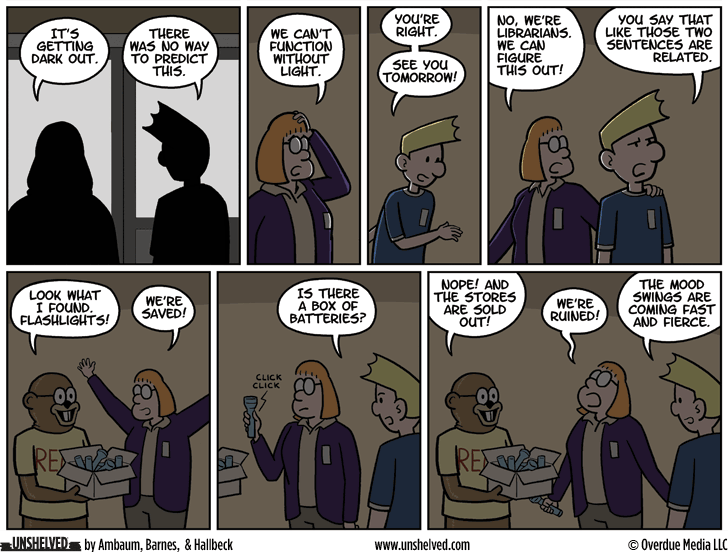 So we decided to get back to basics. We started writing more like we used to, with long discussions (i.e. arguments) about plot lines and character motivations. This month you’re seeing the first fruits of our labor, as Mel decides to keep the library open when Mallville is plunged into darkness. We’re having a lot more fun already, and we hope you are too.